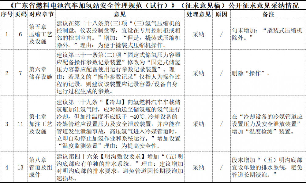 4月26日,廣東省住房和城鄉建設廳亦發布了關于《廣東省燃料電池汽車加氫站安全管理規范(試行)》(征求意見稿)公開征求意見采納情況的公示。