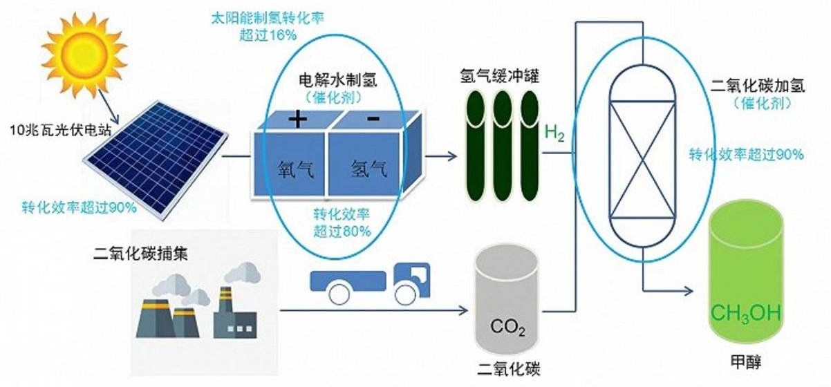 目前已有液態(tài)陽光甲醇生產(chǎn)技術(shù)來應(yīng)對甲醇應(yīng)用的碳排困境。液態(tài)陽光是指將太陽能/風(fēng)能制氫所獲得的氫氣,與捕集的二氧化碳結(jié)合生成甲醇。應(yīng)用此途徑生成的甲醇能夠以液態(tài)的形式儲存氫氣,方便運輸,安全高效,也能夠?qū)崿F(xiàn)碳排放閉環(huán),從而達到碳中和的目標。